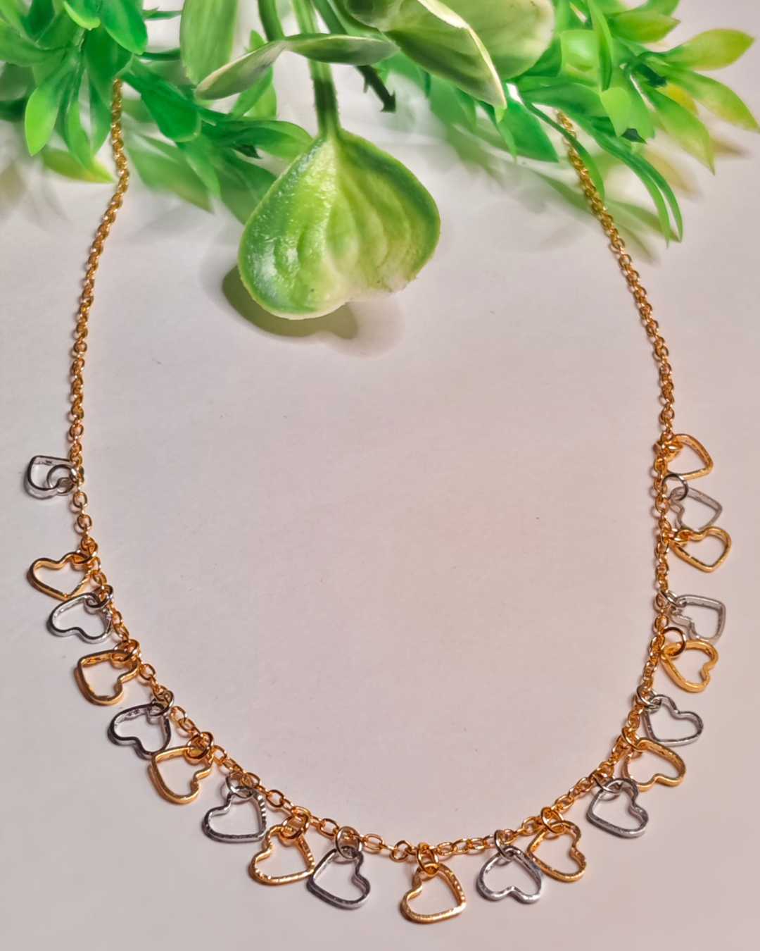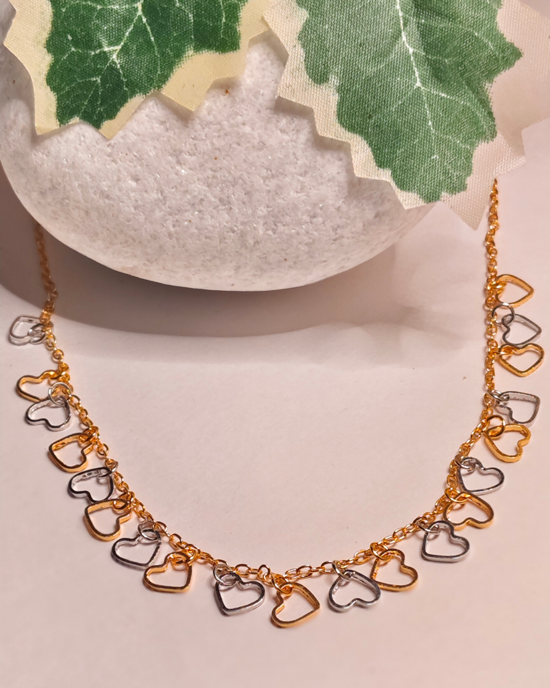 Shop the charming Dual Tone Heart Charm Necklace. This Tarnish Free Love Chain India is made from stainless steel and features alternating gold and silver heart charms, perfect for Everyday Wear Minimalist Heart Chain or gifting.