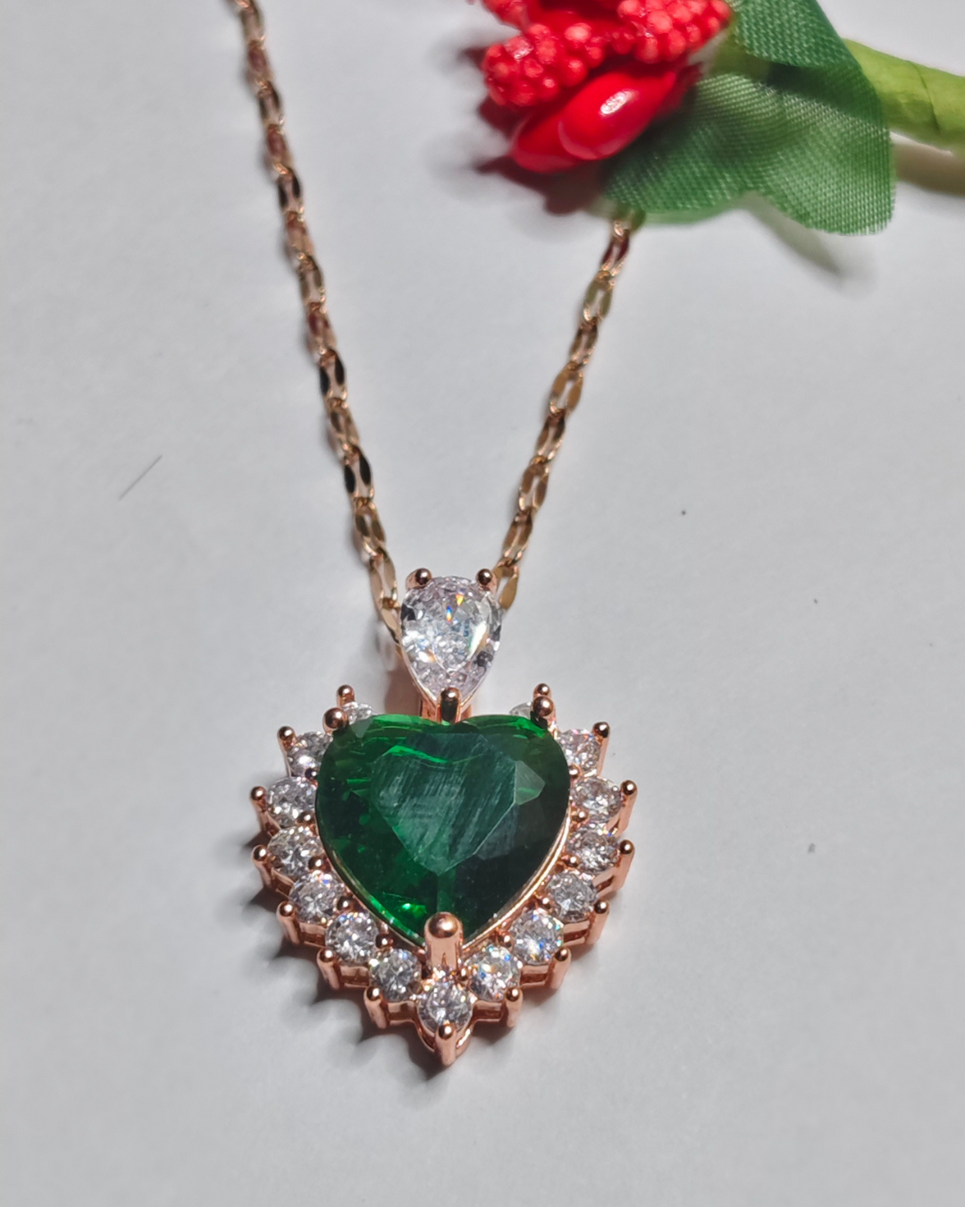 Discover timeless glamour with the Esmeralda Green Stone Necklace, a piece designed to captivate and enchant. This stunning heart pendant with chain showcases a deep emerald hue, reminiscent of classic royal jewels. If you’re looking for a high-quality emerald necklace imitation with unmatched sparkle, this exquisite piece is your perfect choice. The rich color of this rose gold necklace for women makes it a sophisticated and luxurious addition to any jewellery collection.