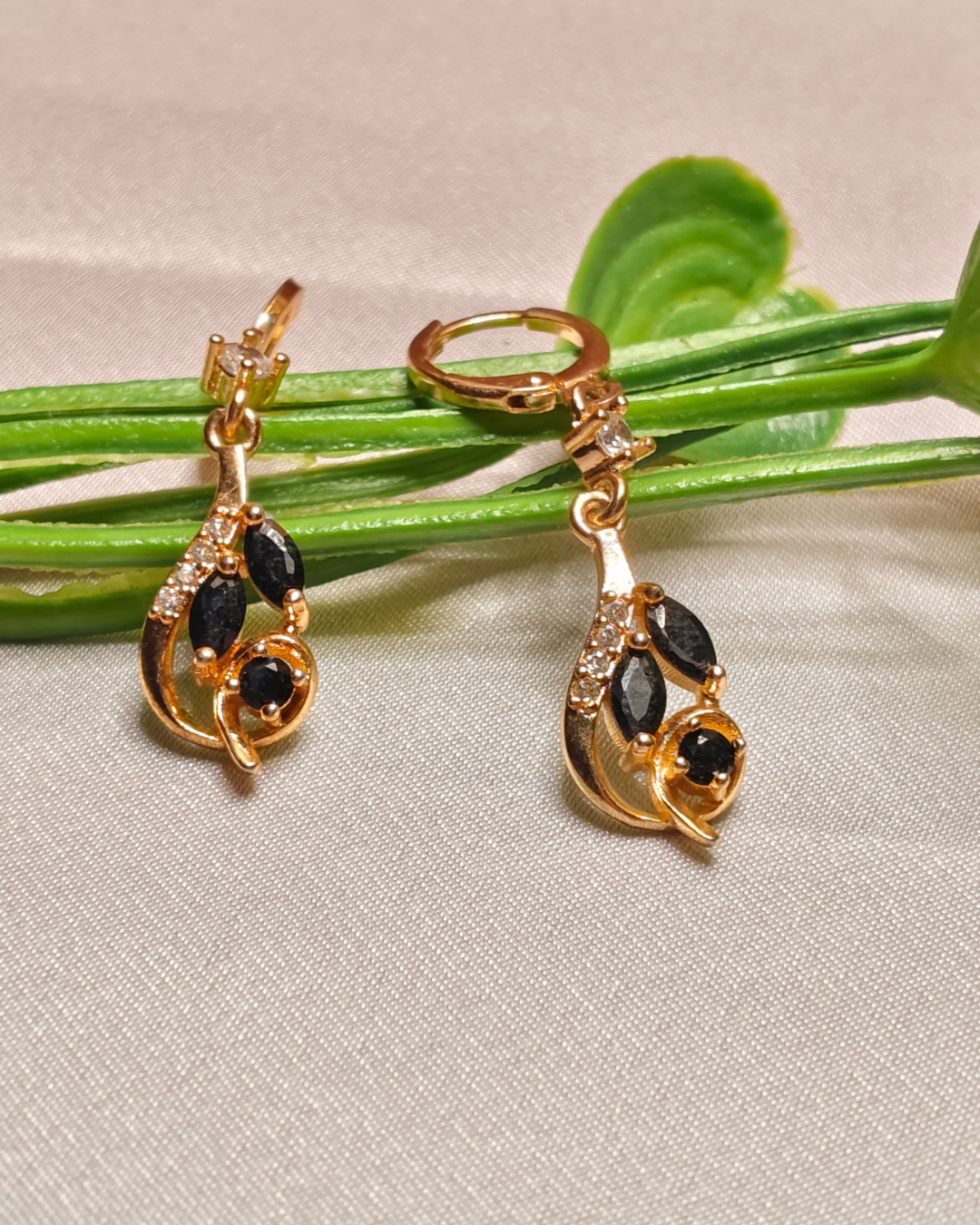 Shop these chic Gold Plated Black Swirl Drop Earrings. This Tarnish Free Black Stone Dangle Earrings set features a Modern CZ Curved Design Earrings India and a secure Everyday Wear Secure Huggie Earrings clasp.