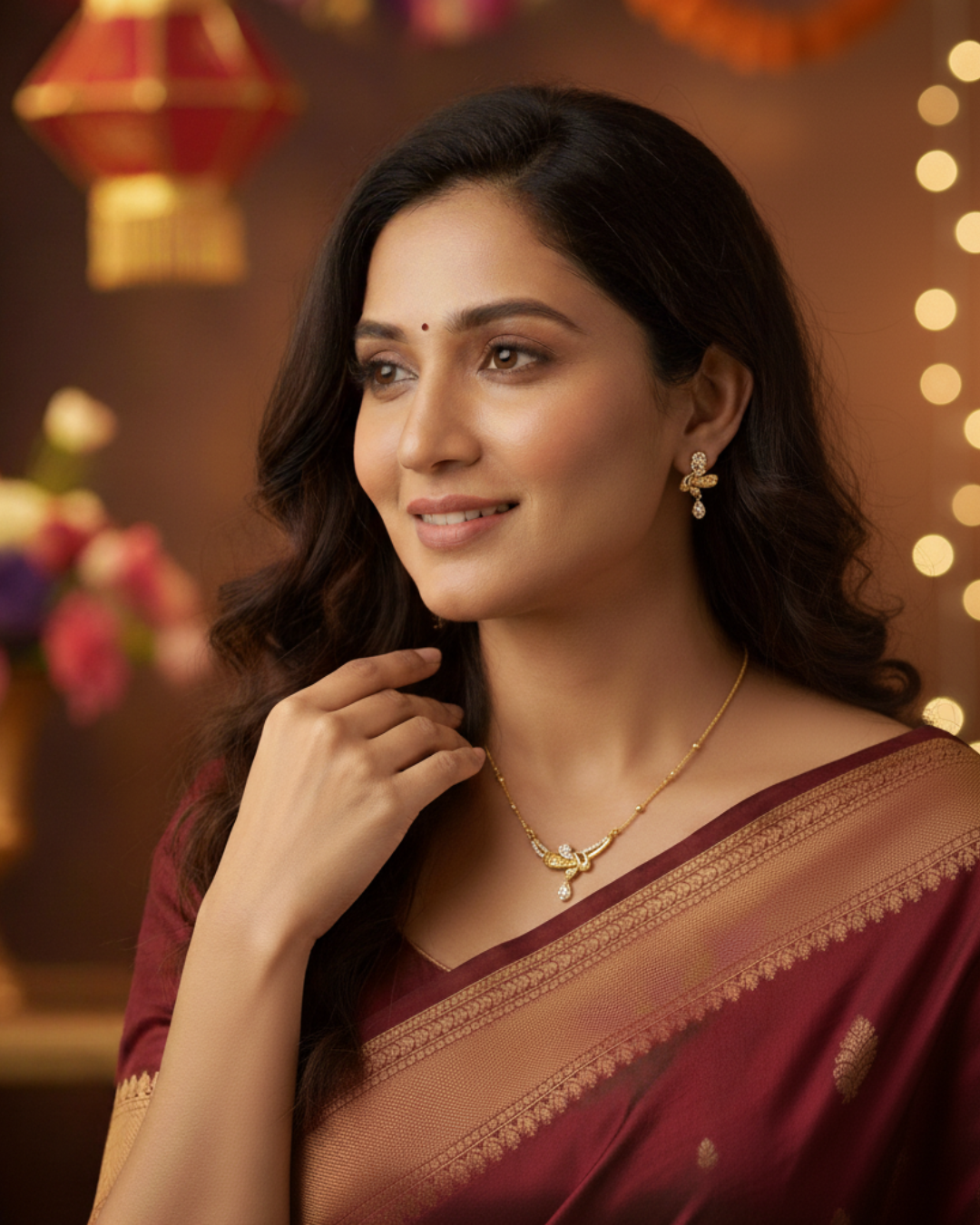 Make a sophisticated statement with the Gold Plated Swirl CZ Necklace Set. This matching ensemble features an Abstract Designer Gold Chain Set India with intricate, swirling designs accented with brilliant pave-set CZ stones. The pendant is suspended on a delicate, beaded chain and boasts a graceful CZ dangle. In fact, the overall fluid design is perfect for those who prefer modern, yet opulent styles.