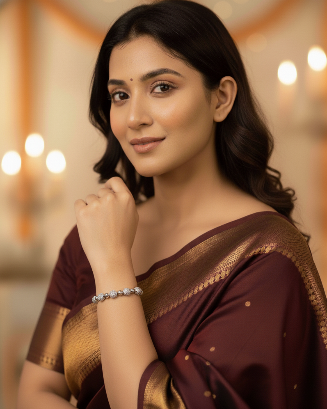 This bracelet offers the luxurious look of silver and diamonds with the practical durability necessary for the Indian market.