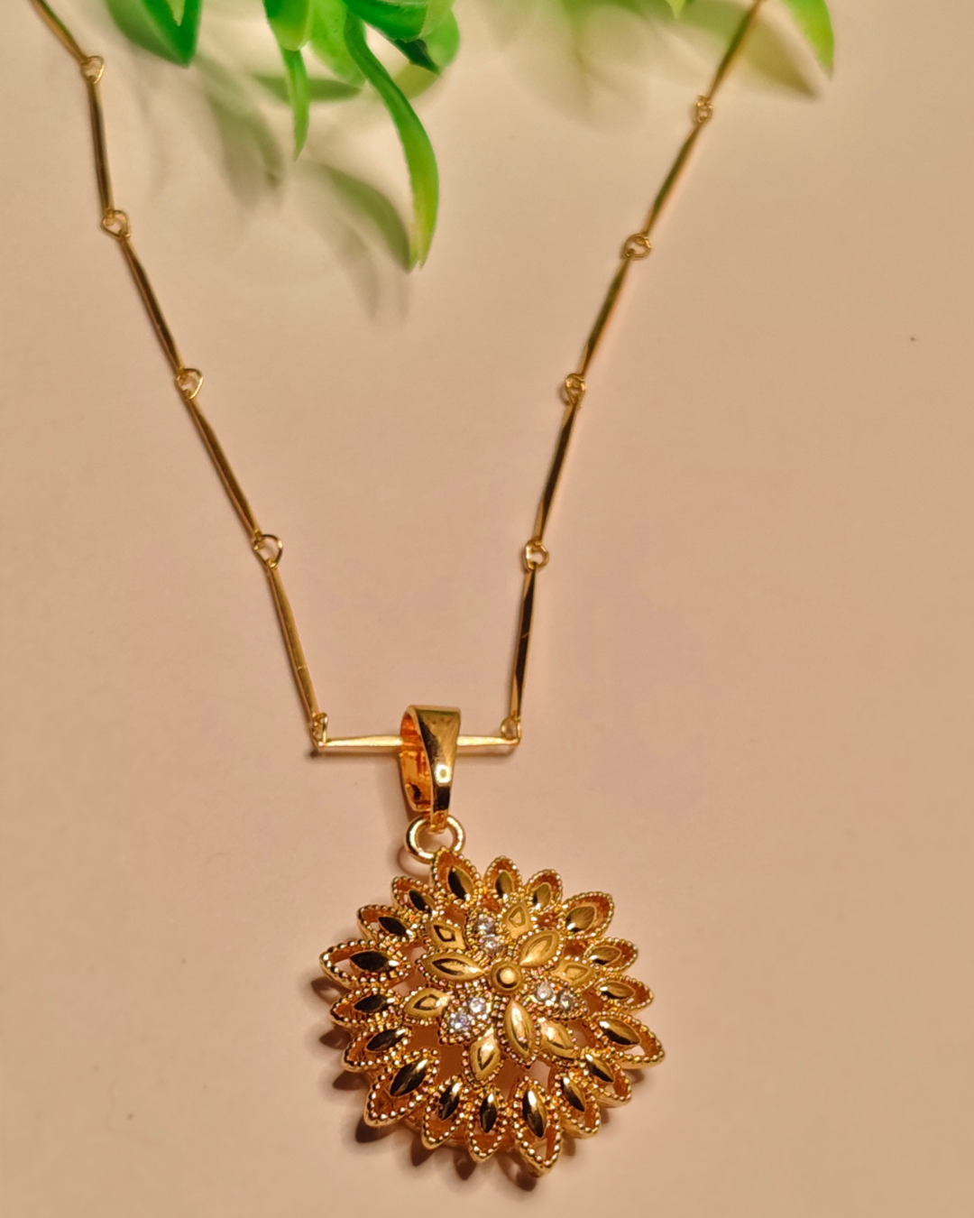 Introduce the captivating Traditional Gold Plated Flower Necklace, a detailed piece that beautifully mimics the richness of heirloom jewelry. This pendant showcases a radiant, layered flower or sunburst motif with a fine, Ornate Filigree Design Gold Pendent texture on its petals and sparkling CZ accents at the center. In fact, its sophisticated detailing makes it an elegant choice for both festive occasions and daily accessorizing.