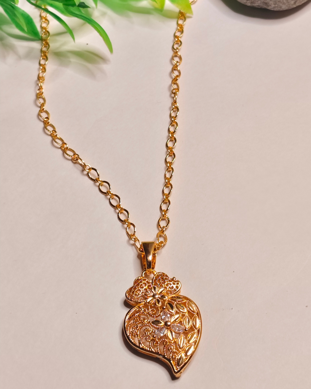 Shop this elegant Traditional Gold Plated Heart Pendant. This Tarnish Free Filigree Chain India is made from stainless steel and features an ornate floral heart design, perfect for Everyday Wear Link Chain Gold Pendent or gifting.